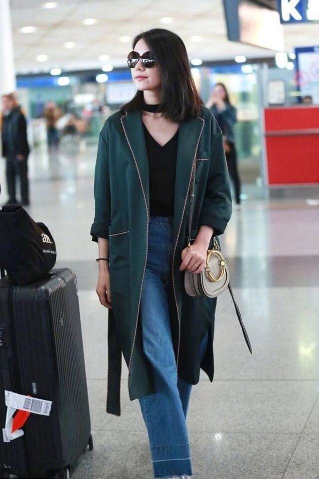 高圓圓一襲墨綠色長款睡衣,隨性瀟灑,撞色捆邊增添視覺感,內(nèi)搭V領T恤,性感鎖骨清晰可見散發(fā)著女人味,下身穿著牛仔闊腿褲氣場十足。
