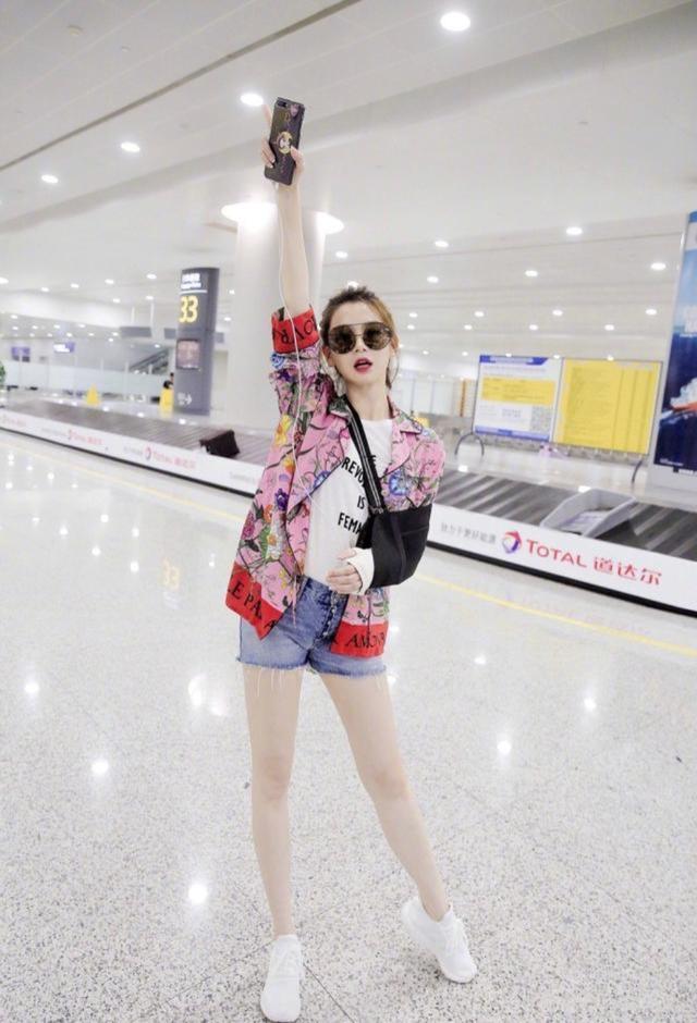 玩起混搭也是666,別具一格,戚薇身穿小白T+藍色牛仔短褲+小白鞋,很簡潔清爽的一身,實力秀美腿吸睛感十足,上身配上粉色印花睡衣,慵懶時髦,扎起小馬尾盡顯青春氣息。