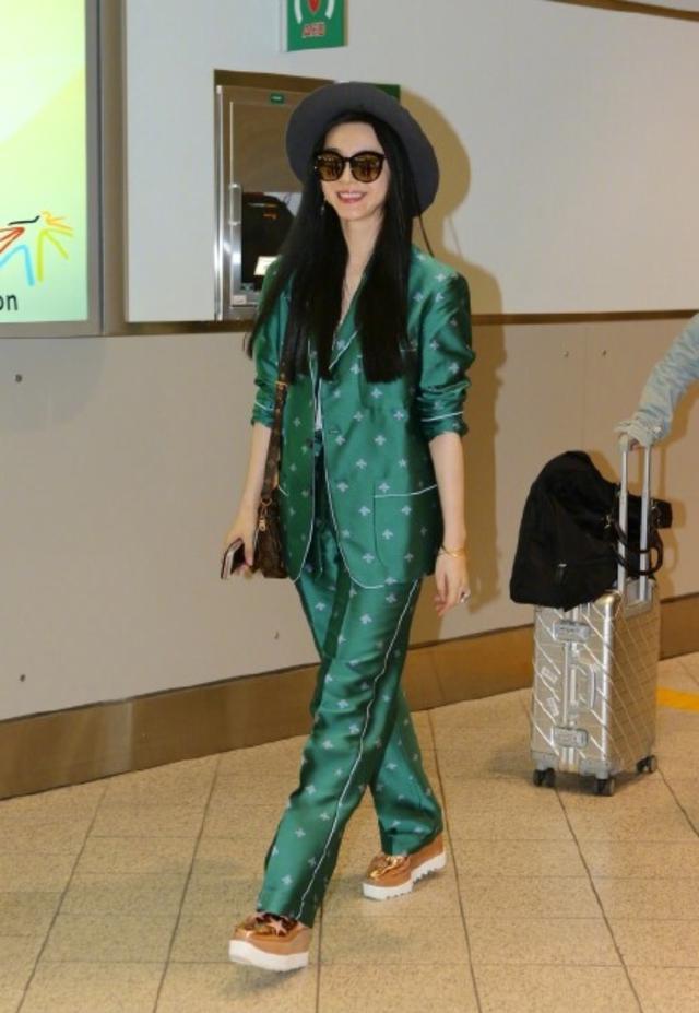 范冰冰身穿綠色印花睡衣套裝,靚麗吸睛,敞開來穿更多了幾分瀟灑的味道,只是腳上這雙金色厚底鞋真的不好看啊,和服裝風格也是一點不搭。