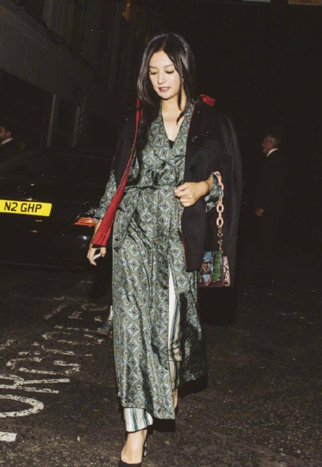 趙薇這一身搭配得也很有氣場,長款睡袍疊穿藍白條紋長褲和黑色斗篷外套,霸氣十足,時尚御姐范。