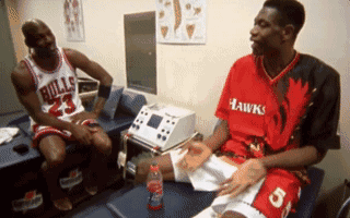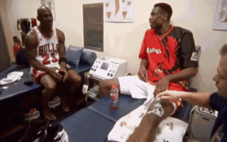 一晃到了 1997 年全明星周末,穆托姆博在休息室和喬丹吹牛。