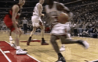 第一次和穆托姆博交手,喬丹拿下了 37 分和勝利。喬丹將第 37 分收入囊中的方式還很特別,足以載入史冊:閉眼罰進(jìn)了最后一球。
