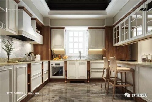 歐式風(fēng)格,落地裝飾柱、地腳板的設(shè)計(jì)也是一個(gè)特色,讓人感覺(jué)整套櫥柜更加舒適;白橡木木紋,讓廚房感覺(jué)高貴、大方,玻璃門吊柜設(shè)計(jì),增加了廚房空間的通透性。