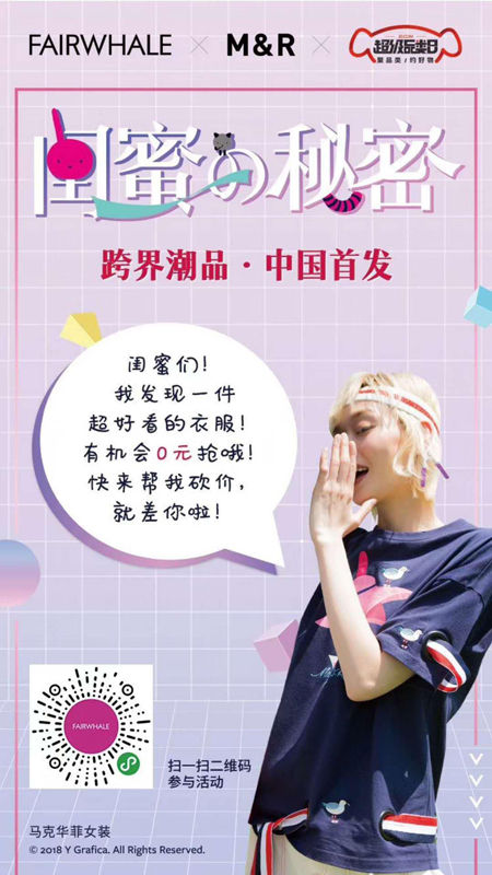 除了選擇在5.8京東超品日首發(fā),預售期間還有其他有趣的營銷活動為其造勢。FAIRWHALE女裝特地開發(fā)了一款小程序,結(jié)合時下流行的邀朋友砍價的形式,增強與朋友間互動性與線上傳播性。小程序主題為“閨蜜的秘密”,意在分享鏈接邀請閨蜜為她砍價,最低可以砍至0元,由此可見FAIRWHALE女裝滿滿的誠意。