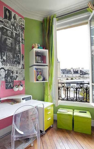 編輯點(diǎn)評(píng):紅色跟綠色兩種顏色相隔較遠(yuǎn),兩種顏色都很清新,淺淡的粉紅不甜膩,蘋果綠的墻面又給室內(nèi)增添了清新自然的感覺(jué)。