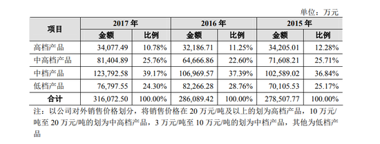 受此影響,西鳳酒陸續(xù)推出了紅西鳳、鳳香經(jīng)典、旗幟西鳳等多款產(chǎn)品,尤其是定位高端的旗幟西鳳被寄予厚望,被視為西鳳酒的重要戰(zhàn)略產(chǎn)品。盡管在招股說(shuō)明書(shū)中,并未披露旗幟西鳳的具體業(yè)績(jī),但是以其公布的產(chǎn)品構(gòu)成檔次的銷(xiāo)售業(yè)績(jī)來(lái)看,作為西鳳酒產(chǎn)品體系塔尖的高檔產(chǎn)品系列,2017年收入為3.41億元,占比僅為10.78%。占比較大的是中高檔和中檔產(chǎn)品,分別25.76%和39.17%。