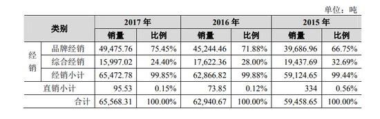 據(jù)了解,西鳳酒品牌經(jīng)銷(xiāo)產(chǎn)品包括華山論劍、國(guó)花瓷以及“收編”前的西鳳六年和十五年。據(jù)西鳳酒的招股說(shuō)明書(shū)顯示,西鳳酒品牌經(jīng)銷(xiāo)渠道銷(xiāo)量的占比在2015年、2016年、2017年分別為66.75%、71.88%和75.45%,比重非常高。