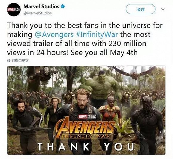 2017年11月29日晚,《復聯(lián)3》發(fā)布了長達2分24秒的首支全長預告片。官方數(shù)據(jù)顯示,上線24小時,這部預告片的播放量就達到了2.3億次。