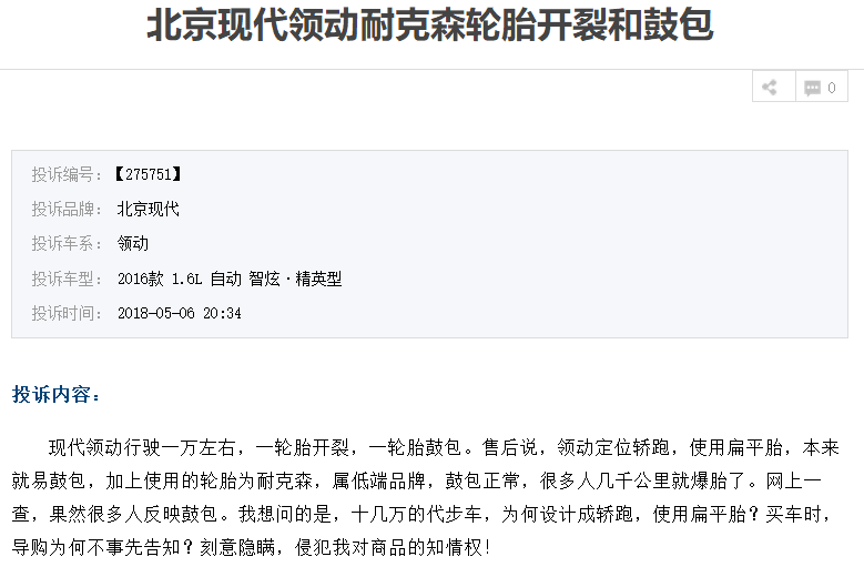 原標(biāo)題:北京現(xiàn)代領(lǐng)動(dòng)使用的輪胎質(zhì)量差,頻頻出現(xiàn)在投訴網(wǎng)站上!