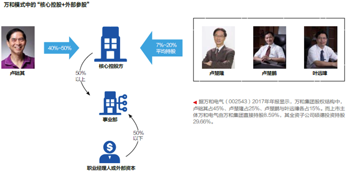 一個(gè)家族企業(yè),就這樣拼湊起來。萬和之 “和”,一開始就在維系4人間的利益之“和”:持股方案中,盧礎(chǔ)其占大頭,另3人基本平均持股,4人被捆成了一個(gè)利益整體。