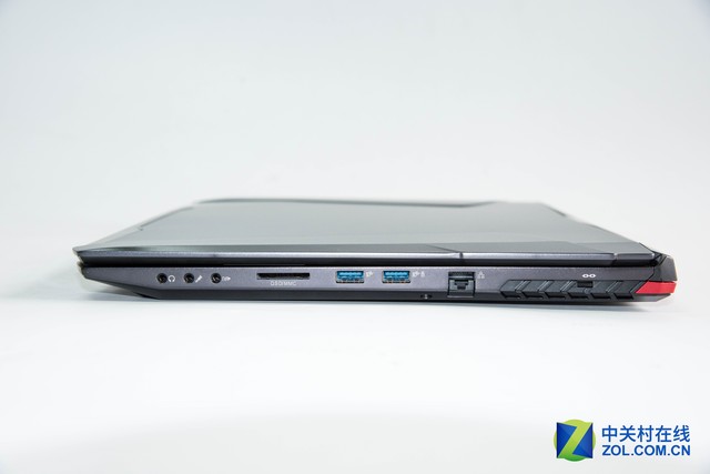 右側(cè)接口:耳機(jī)、麥克風(fēng)、音頻輸出、SD插槽、2個(gè)USB3.1、RJ-45網(wǎng)口、鎖孔