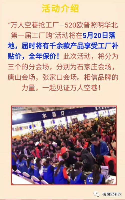 歐普照明河北運(yùn)營中心石家莊分中心銷售總監(jiān)鄧盼偉:肯定的。活動(dòng)當(dāng)天去歐普的各個(gè)門店會(huì)有一張200元的VIP的入場券。這個(gè)入場券可以在當(dāng)天在活動(dòng)現(xiàn)場領(lǐng)取價(jià)值299元的護(hù)眼燈一臺。另外持有這張入場券還可以享受定金翻倍,現(xiàn)場訂單滿3000,直接可以抵200元,另外,開關(guān)系列的再低100,水銀燈滿5000再低200,然后西式復(fù)古滿5000再低100。集成吊頂滿3000,再低100。當(dāng)天還有砸金蛋和抽獎(jiǎng)的環(huán)節(jié)。滿3000元就可以砸金蛋一次,還有幸運(yùn)大抽獎(jiǎng)環(huán)節(jié),可以把全套家電帶回家(有電視、空調(diào)、冰箱、洗衣機(jī))。