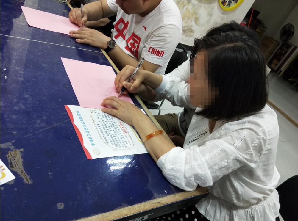 相互認(rèn)識(shí)后,社工給每名殘康學(xué)員發(fā)一張紅紙讓他們畫(huà)一個(gè)愛(ài)心和寫(xiě)祝福語(yǔ)獻(xiàn)給自己的母親,同時(shí)獻(xiàn)上一盒巧克力,給母親一個(gè)簡(jiǎn)單的擁抱。\u00A0
