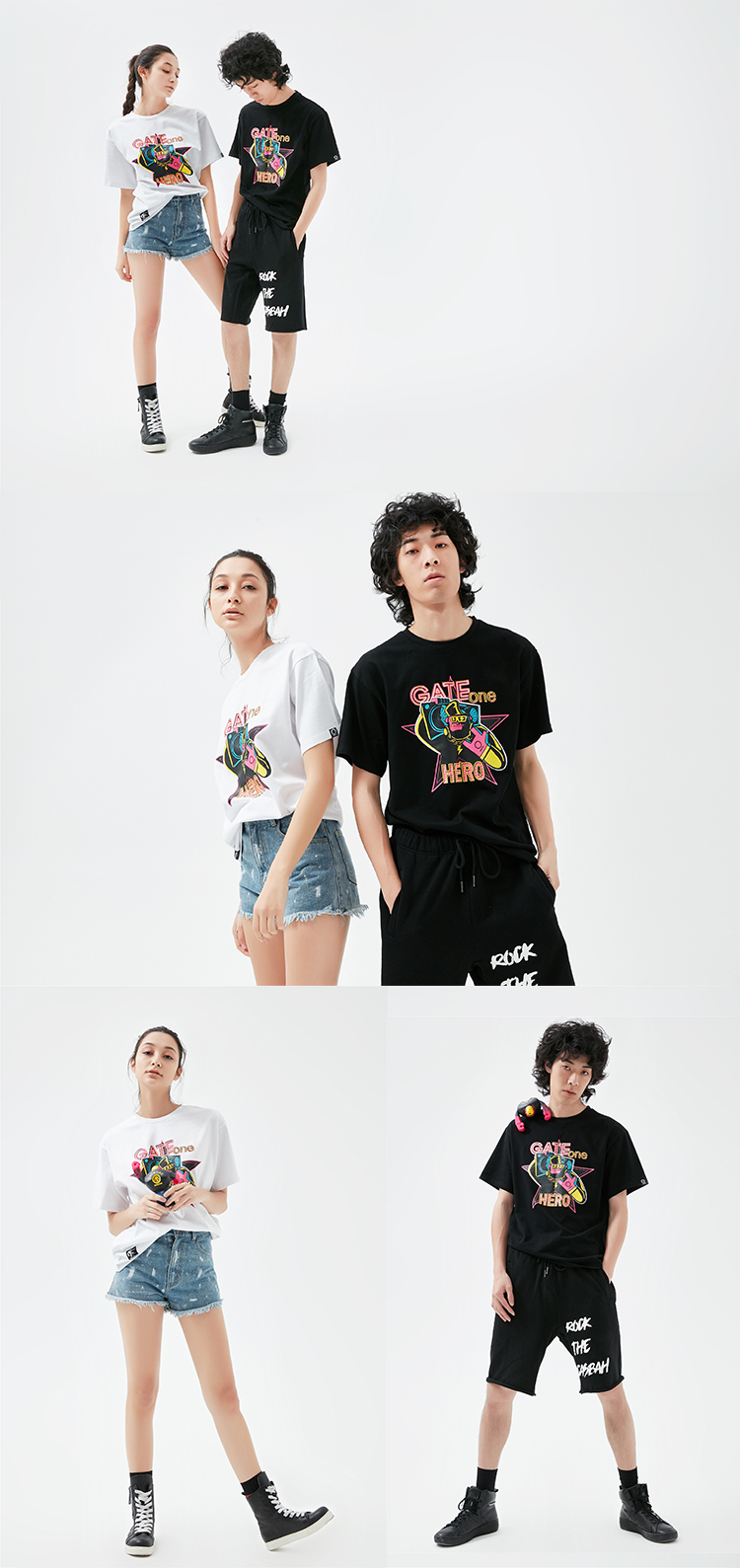 在T恤的設(shè)計(jì)上包含黑、白兩個(gè)顏色,在圖案的設(shè)計(jì)上,源于街頭文化的靈感元素清晰可見(jiàn),嘻哈符號(hào)、鴨舌帽、音響等設(shè)計(jì)元素以大膽的組合、鮮明的配色彰顯出強(qiáng)烈的視覺(jué)圖案與個(gè)性風(fēng)格。面料上采用優(yōu)質(zhì)純棉,實(shí)穿舒適。精巧的細(xì)節(jié)設(shè)計(jì),體現(xiàn)GATEONE特有的標(biāo)識(shí)。也正是這樣打破傳統(tǒng)的英雄與街頭的文化碰撞,以天馬行空的創(chuàng)意發(fā)想,不懼陳規(guī)的肆意表達(dá),突破了T恤設(shè)計(jì)的無(wú)限可能。