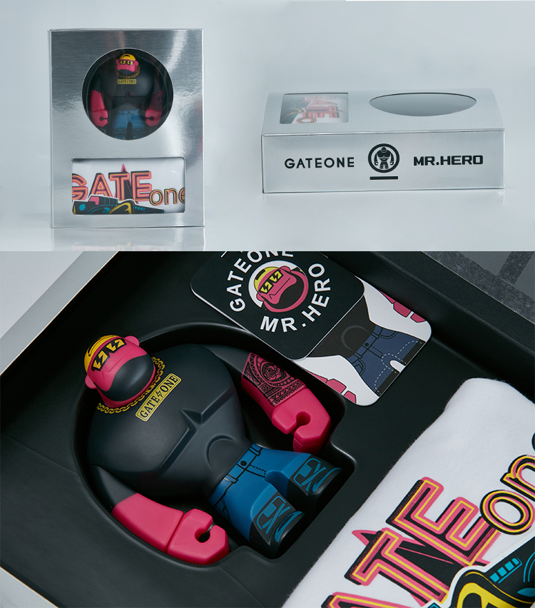 本次合作聯(lián)名系列,凝聚了MR·HERO “BE YOURSELF BE HERO”動(dòng)感、三維地設(shè)計(jì)美學(xué)以及GATEONE潮流集合店一貫的先鋒且實(shí)穿的服飾設(shè)計(jì)理念,推出了T恤與玩偶的套裝組合。在設(shè)計(jì)中融入前所未有的表達(dá)方式,從玩偶形象的設(shè)定到品牌結(jié)合乃至包裝,都注入了創(chuàng)新與品質(zhì)。\u00A0