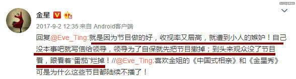 之前她主持的一檔脫口秀節(jié)目--《金星秀》停播,原定她為主持人的另一檔節(jié)目也被換主持人,甚至在娛樂圈快查無此人了,引發(fā)很多網(wǎng)友的猜議,大家都認(rèn)為是因為她在無意中得罪了別人,所以才被封殺的。