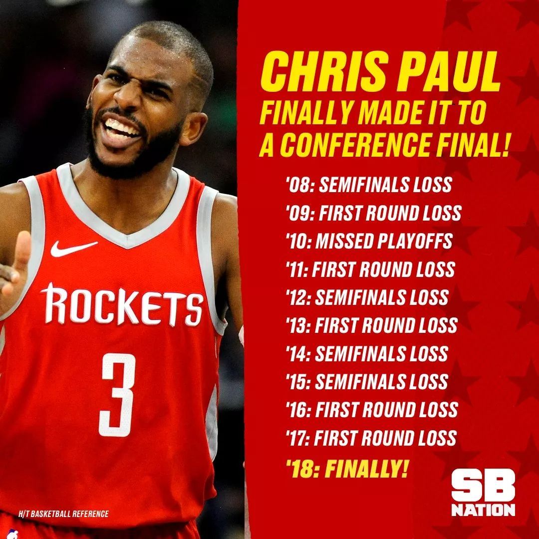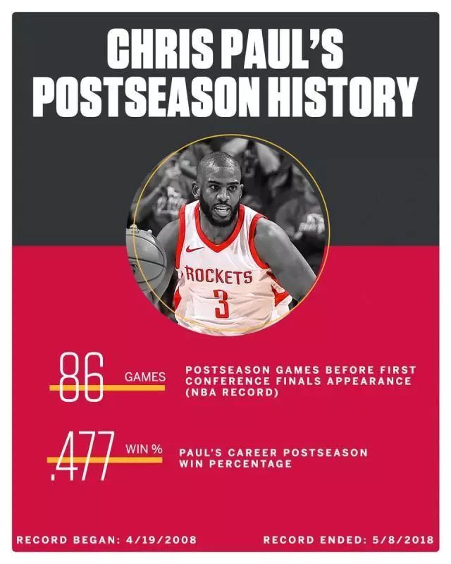 86場季后賽比賽,0場分區(qū)決賽比賽,這項由克里斯·保羅持有的尷尬紀(jì)錄終于成為歷史了。隨著火箭今日112比102擊敗爵士,他們以總比分4比1淘汰對手挺進(jìn)了西部決賽。等待著保羅的是職業(yè)生涯第87場季后賽比賽,也是他的第一次西決之旅。