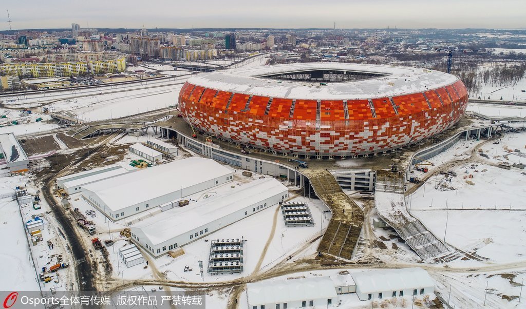 薩蘭斯克下起了大雪,橙色的莫爾多維亞競(jìng)技場(chǎng)矗立在雪中,景色迷人。