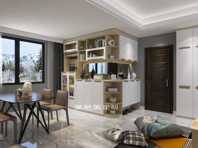 餐邊柜和入戶柜相結(jié)合完整利用兩面墻的空間,折角處的圓弧展示設(shè)計,既美觀又安全防撞。