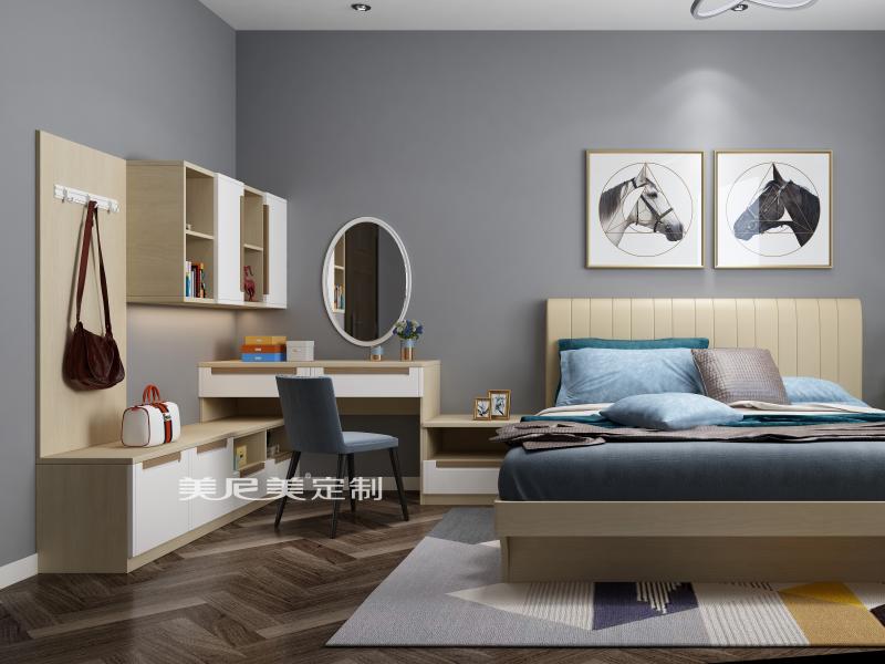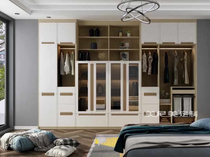 臥室沒有多余的柜式陳列,一個包羅萬有的衣柜便在有限空間里將臥室和衣帽間融于一室。