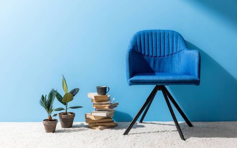 藍(lán)色的椅子加上素色的地毯旨在拉低空間溫度,感官上提供清涼。整體的搭配有助于調(diào)和夏天緩解的悶熱,讓人心神舒暢。