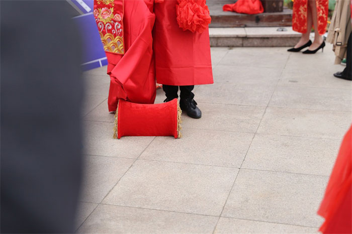 一條紅絲綢,兩人牽繡球,