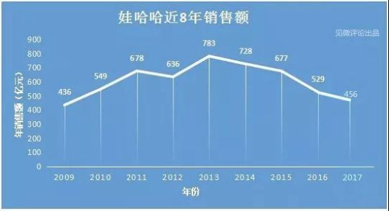 據(jù)全國(guó)工商聯(lián)經(jīng)濟(jì)部發(fā)布的《中國(guó)民營(yíng)企業(yè)500強(qiáng)調(diào)研分析報(bào)告》,娃哈哈集團(tuán)2013年銷售額高達(dá)783億元,之后營(yíng)收連年下滑,2017年娃哈哈的營(yíng)收只有456億元,跌破了500億紅線。