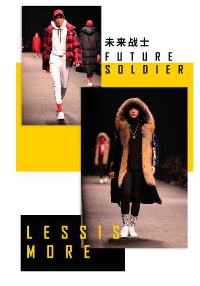 繼秋季”軍工崛起“主題之后,2018年冬季利郎推出未來戰(zhàn)士系列,圍繞”戰(zhàn)爭與和平“年度主題,堅(jiān)持原有的風(fēng)格的同時(shí)又追求更多變化。主線冰冷的武器,裝備精良的鎧甲,血色戰(zhàn)場的殺戮,戰(zhàn)后黎明的曙光,分別以金、銀、紅、黃為本季點(diǎn)綴色,簡約而不失時(shí)尚,為黑白灰增添艷而不酌的視覺體驗(yàn)。服裝上厚重的廓形配合圖形設(shè)計(jì)膠印,極大提升了層次感,玩轉(zhuǎn)率性時(shí)尚。