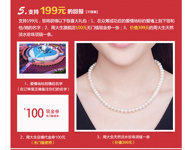 原標(biāo)題:周大生回應(yīng)眾籌建造“愛(ài)情地標(biāo)”三年無(wú)果:預(yù)計(jì)下半年建成 周大生于2015年2月開(kāi)展的眾籌建設(shè)“愛(ài)情地標(biāo)”項(xiàng)目,共籌集357多萬(wàn)元。 近日,安徽合肥的消費(fèi)者陸先生在澎湃質(zhì)量報(bào)告投訴平臺(tái)(https://www.thepaper.cn/consumersComplaint.jsp)反映,其于2015年2月參與了由珠寶品牌“周大生”發(fā)起的“以愛(ài)之名,眾籌全球愛(ài)情地標(biāo)”項(xiàng)目,周大生在眾籌成功并募集到357萬(wàn)多元的資金后,其承諾2015年下半年建成并鐫刻眾籌者及愛(ài)侶姓名的所謂“愛(ài)情地標(biāo)”,但一直未建成,三年來(lái)此事沒(méi)有下文。 對(duì)此,5月24日晚,周大生珠寶股份有限公司相關(guān)人士對(duì)此向澎湃新聞(www.thepaper.cn)回應(yīng)稱,該項(xiàng)目此前在圖紙?jiān)O(shè)計(jì)及施工等環(huán)節(jié)遭遇障礙,目前項(xiàng)目已在施工準(zhǔn)備階段,預(yù)計(jì)今年下半年可建成,相關(guān)情況將向客戶公示。 支持了199元的陸先生按照規(guī)則可在建成的“愛(ài)情地標(biāo)”上刻上自己和妻子的名字。 據(jù)該眾籌項(xiàng)目活動(dòng)網(wǎng)頁(yè)顯示,上述眾籌項(xiàng)目是由知名珠寶品牌周大生發(fā)起,聯(lián)合海南三亞玫瑰谷、北京大地風(fēng)景建筑公司及淘寶眾籌開(kāi)展,項(xiàng)目將使用眾籌來(lái)的資金,在海南三亞玫瑰谷建設(shè)一座名為“愛(ài)情地標(biāo)”的建筑,建筑包含占地面積達(dá)600平方米的所謂“世界最大愛(ài)墻”、門樓、水面等設(shè)施。 參與眾籌的消費(fèi)者,可選擇從1元到9999元的13個(gè)不同金額支持該項(xiàng)目,消費(fèi)者在獲得周大生的禮品之外,其中支持99元及以上的消費(fèi)者還可在建成后的“愛(ài)情地標(biāo)”的愛(ài)墻上刻下自己和愛(ài)侶的姓名。 據(jù)活動(dòng)網(wǎng)頁(yè)內(nèi)容顯示,該項(xiàng)目已在2015年3月13日結(jié)束,共有273720人參與眾籌,籌得資金3578378元,主辦方計(jì)劃在2015年8月20日七夕節(jié)建成“愛(ài)情地標(biāo)”。 活動(dòng)曾承諾在2015年8月即可建成“愛(ài)情地標(biāo)”但至今無(wú)下文。 “當(dāng)時(shí)就相信了交錢了,說(shuō)2015年下半年就可以建成的,但是一直不了了之,雖然收到了禮品,但是大家期待的‘愛(ài)情地標(biāo)’卻沒(méi)有動(dòng)靜,后來(lái)我也和周大生多次聯(lián)系過(guò),他們說(shuō)土地報(bào)批的問(wèn)題導(dǎo)致項(xiàng)目延期。”陸先生對(duì)澎湃新聞?wù)f,雖然自己只是交了199元,但是此事應(yīng)給眾多活動(dòng)參與者一個(gè)交代。 對(duì)此,周大生相關(guān)人士回應(yīng)澎湃新聞?wù)f,目前已有專人對(duì)接此事,此前遇到的一些障礙已經(jīng)解決,“今年下半年會(huì)建設(shè)完畢。這個(gè)過(guò)程比較曲折,之前沒(méi)有處理好,目前已多次溝通解決了問(wèn)題。”