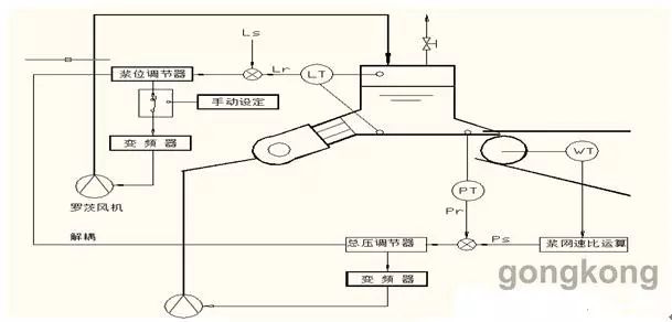 3)總壓頭控制:計算機根據(jù)總壓頭的設(shè)定值、實測值及總壓頭與漿位之間的耦合關(guān)系,經(jīng)過相應(yīng)的控制處理后,給出控制信號(4~20mA DC),通過上漿泵變頻器控制上漿泵的轉(zhuǎn)速,若總壓頭的實際值低于給定值,則增大上漿泵的轉(zhuǎn)速,反之,則減小上漿泵的轉(zhuǎn)速,直至總壓頭達(dá)到設(shè)定值。上漿泵也可手動控制,即在人機界面上將對變頻器的輸出置于“手動”位置,直接控制上漿泵的轉(zhuǎn)速。