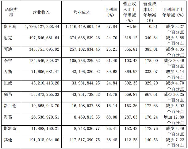 從品牌方面分析,報告期內(nèi),單一貴人鳥品牌銷售收入占公司主營業(yè)務(wù)收入的55.61%,占比情況較比上年減少27.62%,耐克、阿迪達斯、李寧等多品牌的代理銷售收入12.51億元,占公司實現(xiàn)主營業(yè)務(wù)收入的38.72%;
