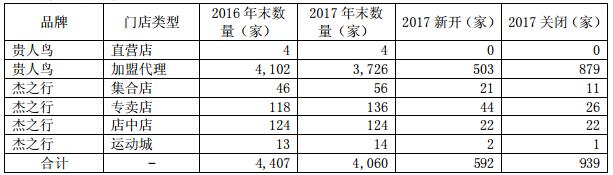 報告指出,截至2017年12月31日,貴人鳥品牌營銷網(wǎng)絡(luò)已覆蓋全國31個省、自治區(qū)及直轄市,零售終端數(shù)量達到3730家,零售終端總面積30.32萬平方米;2017年新開零售終端503家,關(guān)閉零售終端879家。