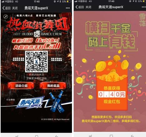 華潤雪花推出“勇闖天涯superX”新品,并不僅僅是新配方、新包裝和新代言,更是要完成雪花啤酒“行業(yè)轉(zhuǎn)型升級的重任”。所謂“升級重任”就是營銷模式的轉(zhuǎn)變,即改變傳統(tǒng)的促銷模式,以二維碼為入口(瓶蓋內(nèi)碼),利用數(shù)字化精準(zhǔn)營銷技術(shù)體系,按訂單、區(qū)域進行準(zhǔn)確激活,靈活綁定和設(shè)置落地營銷策略。借助“勇闖天涯superX”新品的上市,華潤雪花啤酒全新推出“橫掃千金,碼上有獎”的紅包大派放活動,發(fā)力啤酒現(xiàn)飲場所,利用微信掃碼既得紅包的促銷模式,激勵渠道和終端主推新品,刺激消費者現(xiàn)場掃碼領(lǐng)獎,大大增加了開蓋率。