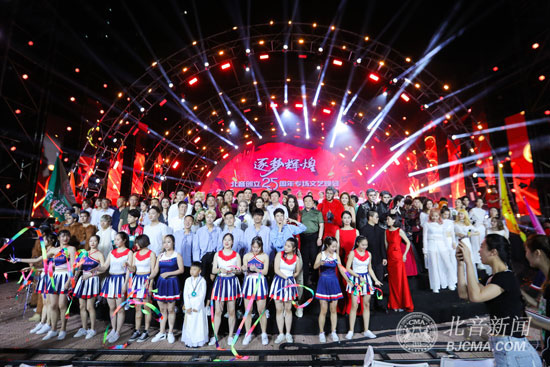 晚會以北音25年的發(fā)展歷程為主線,通過《不忘初心》、《砥礪前行》、《繽紛綻放》、《逐夢輝煌》四個篇章,展現(xiàn)北音25年來“從無到有、從小到大、深耕細耘、拓土開荒”的成長歷程,展現(xiàn)北音25年來“由低到高、由精到尖、碩果累累、璀璨輝煌”的奪目成果,展現(xiàn)北音領導、辛勤園丁、莘莘學子攜手共進、共筑輝煌的璀璨華章。