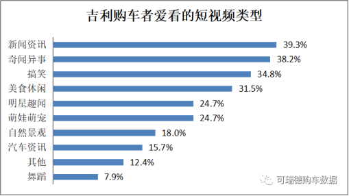 吉利購(gòu)車者者最愛(ài)看的短視頻類型排名前5依次為新聞資訊(39.3%),奇聞異事(38.2%),搞笑(34.8%),美食休閑(31.5%),明星趣聞和萌娃萌寵(24.7%)。對(duì)舞蹈類短視頻關(guān)注度最低。