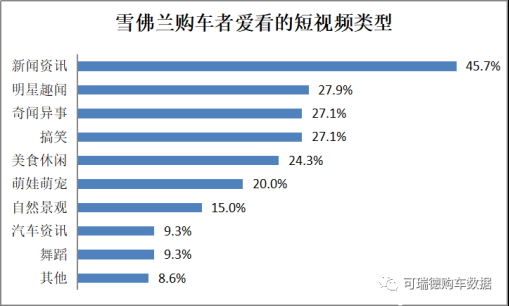 雪佛蘭的購(gòu)車者最喜歡的短視頻類型是新聞資訊,占比為45.7%,并且比重遠(yuǎn)高于其他類型。排名第二的類型是明星趣聞,占比為27.9%,排名第三的奇聞異事占比為27.1%。