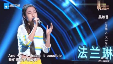 吳映香還曾參加《我想和你唱》,用葡語翻唱了臺(tái)灣著名歌手林志炫的代表作《單身情歌》,原唱林志炫對(duì)她贊賞有加,甚至特意走到臺(tái)下與她探討關(guān)于歌曲改編的看法。吳映香參加《天籟之戰(zhàn)》,張杰為吳映香打破傳統(tǒng),吳映香成為了首位與張杰同臺(tái)PK的女選手。
