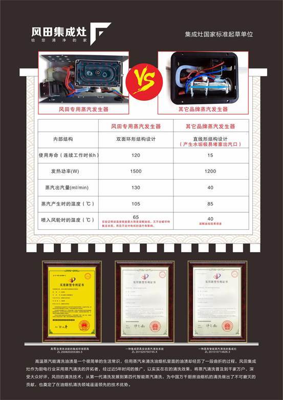 中山市風(fēng)田集成廚衛(wèi)電器有限公司是擁有自主研發(fā)、生產(chǎn)、銷售于一體的大型集成灶生產(chǎn)企業(yè),累計(jì)共獲得40多項(xiàng)國家專利。公司自主研發(fā)的高溫蒸汽清洗專利,更是通過不斷的市場(chǎng)檢驗(yàn)已獲得廣大消費(fèi)者的認(rèn)可。于是集成灶市場(chǎng)出現(xiàn)了一股跟風(fēng)、模仿流,一些不具備資質(zhì)、雜牌集成灶品牌也開始宣傳自己擁有高溫蒸汽清洗技術(shù),從而導(dǎo)致消費(fèi)者無法辨別真?zhèn),上?dāng)受騙。