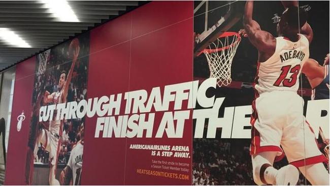 熱火隊(duì)在邁阿密市中心地鐵站打出的這幅廣告是為了宣傳新賽季的季票,廣告的標(biāo)語(yǔ)是:“從人群中突破,在籃框上終結(jié)。”