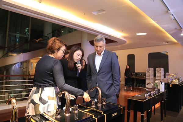 浪鯨衛(wèi)浴市場部總監(jiān)楊紅為意大利陶瓷工業(yè)聯(lián)盟總干事一行講解產(chǎn)品