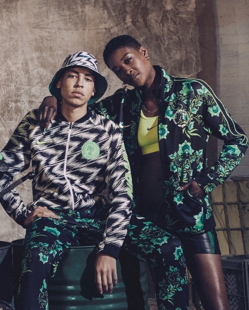 除了球衣之外,耐克還將產品延伸至場下穿著的運動生活類服裝中。美國品牌為尼日利亞國家隊推出整套訓練休閑服飾,印有箭頭狀的羽毛和時髦的花卉,每一件單品相互混搭顯得格外前衛(wèi)。