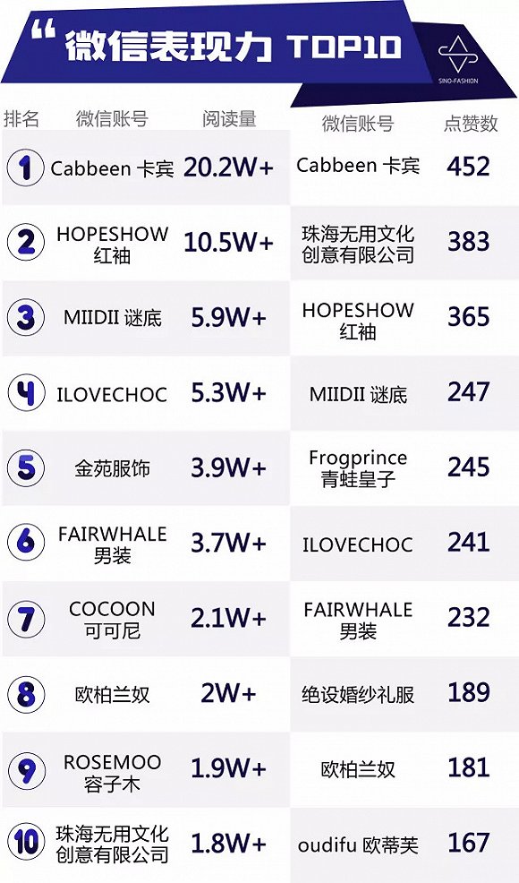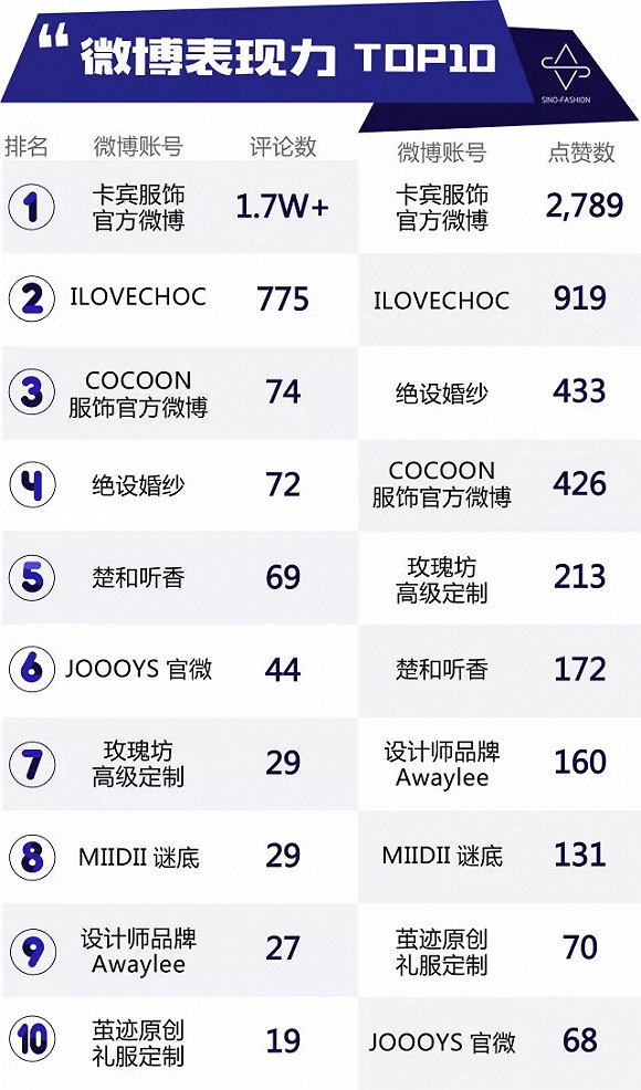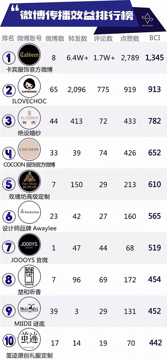 卡賓4月的傳播力指數(shù)(中服指數(shù))排名第一,BCI、WCI都位列第一,微博點贊數(shù)、評論數(shù)也是第一名,感覺人生都要圓滿了吧!卡賓官方微博4月雖只發(fā)布了8條微博,但收到了1.7萬條評論和6.5萬轉(zhuǎn)發(fā)!