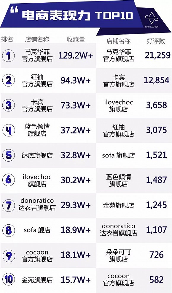 榜單分析:馬克華菲店鋪商品收藏量突飛猛漲,紅袖、卡賓、藍(lán)色傾情也增長飛快,總得來說,形勢甚好。好評數(shù)也有所增長。