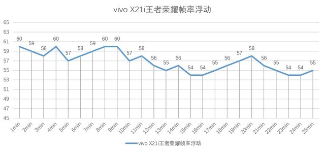 這局游戲一共費(fèi)時(shí)25分鐘,以一分鐘為節(jié)點(diǎn),分別記錄下了幀率,繪制了直觀的折線圖,平均幀率為:56.84幀,完全能保持整局的流暢。并且發(fā)熱也控制的相當(dāng)?shù)轿唬词故情L(zhǎng)時(shí)間打游戲都能保證手感的舒適性。
