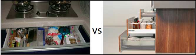 廚房的東西是整個(gè)家中最零散、雜亂的。而很多人并不是很擅長使用廚房的抽屜,大多數(shù)的廚房抽屜一拉開,畫風(fēng)絕對(duì)都是如左圖的器具堆放在一起;如果恰巧有一個(gè)你炒菜時(shí)需要用的小東西在抽屜最里面,那么恭喜你,等你找到時(shí),鍋里的菜多數(shù)已經(jīng)炒老了。但是如果你的抽屜變成右邊的樣子,這種分隔式的收納是西式廚房理念,但是真的很好用,東西一目了然,不同的物件分區(qū),使用和歸納一點(diǎn)都不會(huì)亂。