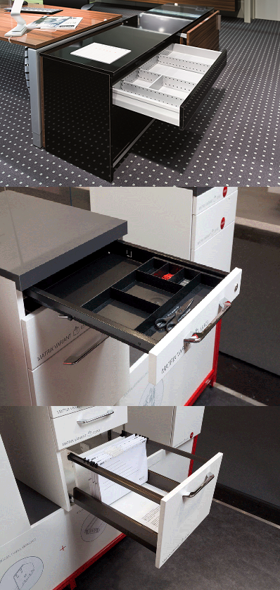 辦公室的抽屜最重要的功能便是收納辦公用品和裝文件。辦公用品收納在淺層,原理同廚房的小物件收納,格子的使用是最方便最一目了然的。高深抽屜,就用于收納文件。同時(shí),對(duì)于辦公室來說,抽屜的使用頻率不低,靜音的性能對(duì)于本就復(fù)雜的辦公環(huán)境格外重要。海福樂 Moovit 弧形鋼抽,讓存儲(chǔ)從未如此精確、安靜和便捷。