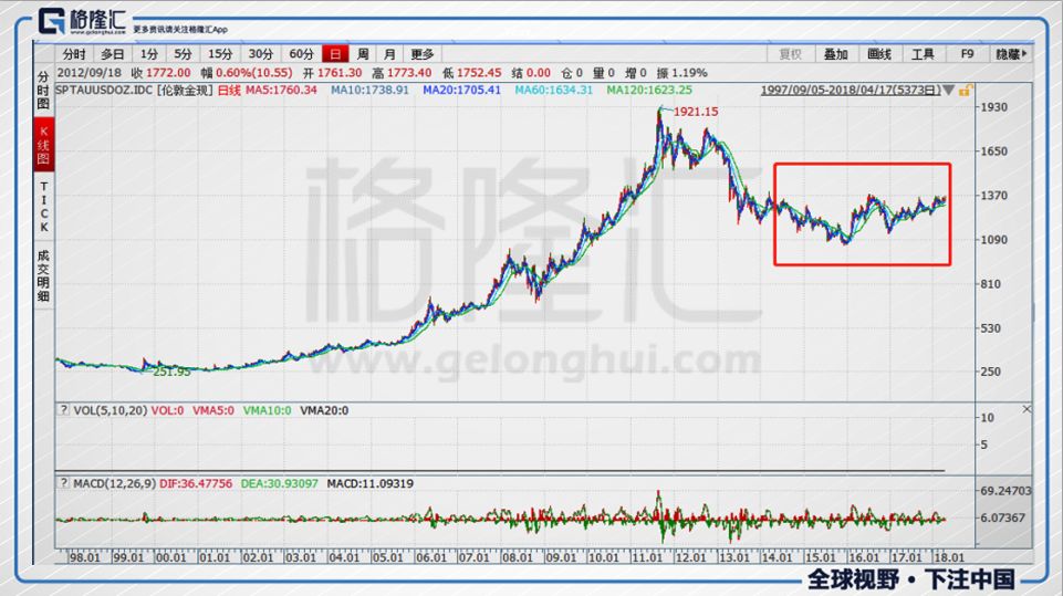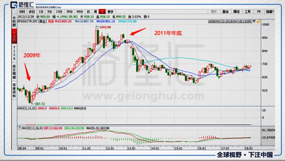 再來看看黃金的價(jià)格走勢,2008年全球性金融危機(jī)爆發(fā)之后,黃金作為避險(xiǎn)貨幣首當(dāng)其沖,一路上漲,一直到了2011年年底才開始止住。