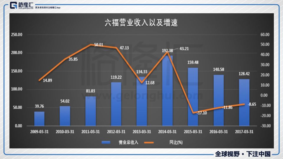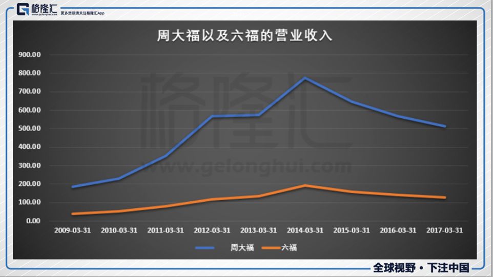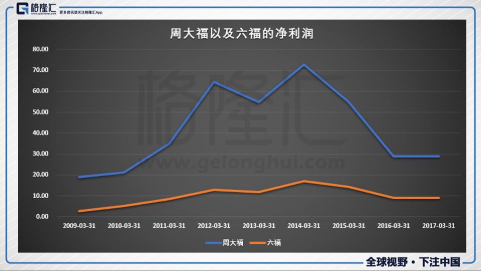 2013年4月25日,黃金一天下跌20%,掀起了黃金搶購潮,各路大媽齊頭并進(jìn),再加上人民幣的走強(qiáng),匯率優(yōu)勢,旅客的進(jìn)攻,周大福以及六福2014財(cái)年(2013年3月1日-2014年3月31日)的營業(yè)收入達(dá)到巔峰時(shí)期,之后營業(yè)收入都一路下降,沒能回到高峰,并且2017年也有小幅度的下滑。