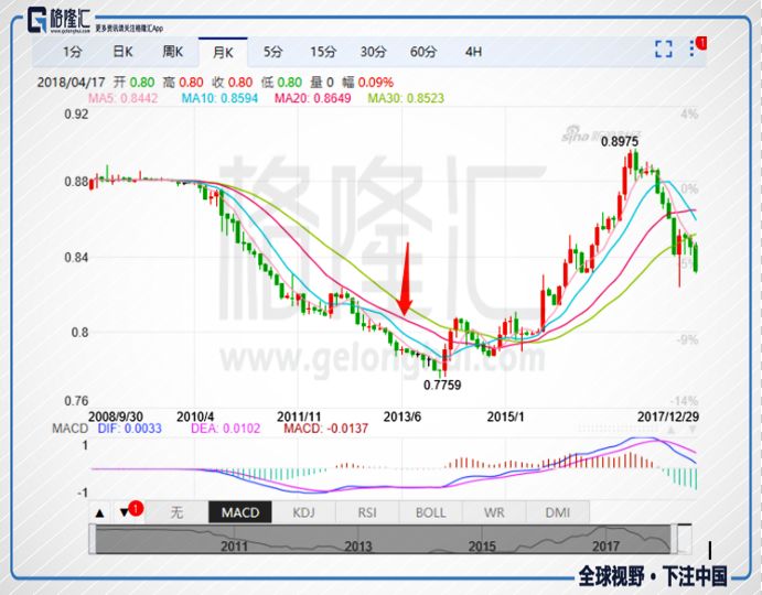 下圖是近十年來,港幣兌人民幣的匯率走勢,可以看到2010年開始,人民幣持續(xù)走強(qiáng),港元兌人民幣匯率下跌,2013年的時(shí)候更是跌倒了低谷了,7.7:10。