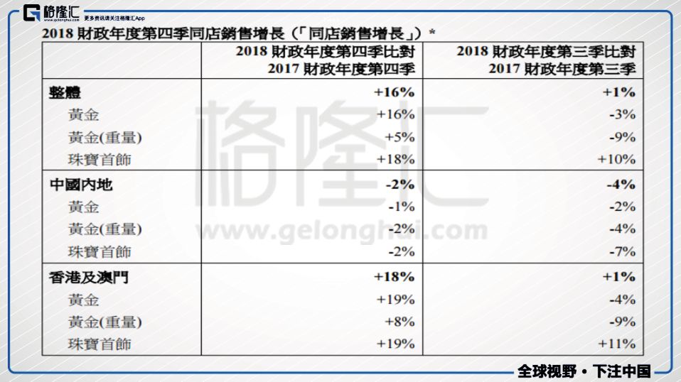 六福集團(tuán)昨日也公布了其2018財(cái)年Q4的數(shù)據(jù),六福的同店銷售錄得16%的良好升幅,超預(yù)期,香港以及澳門市場的黃金及珠寶首飾漲幅同為19%。
